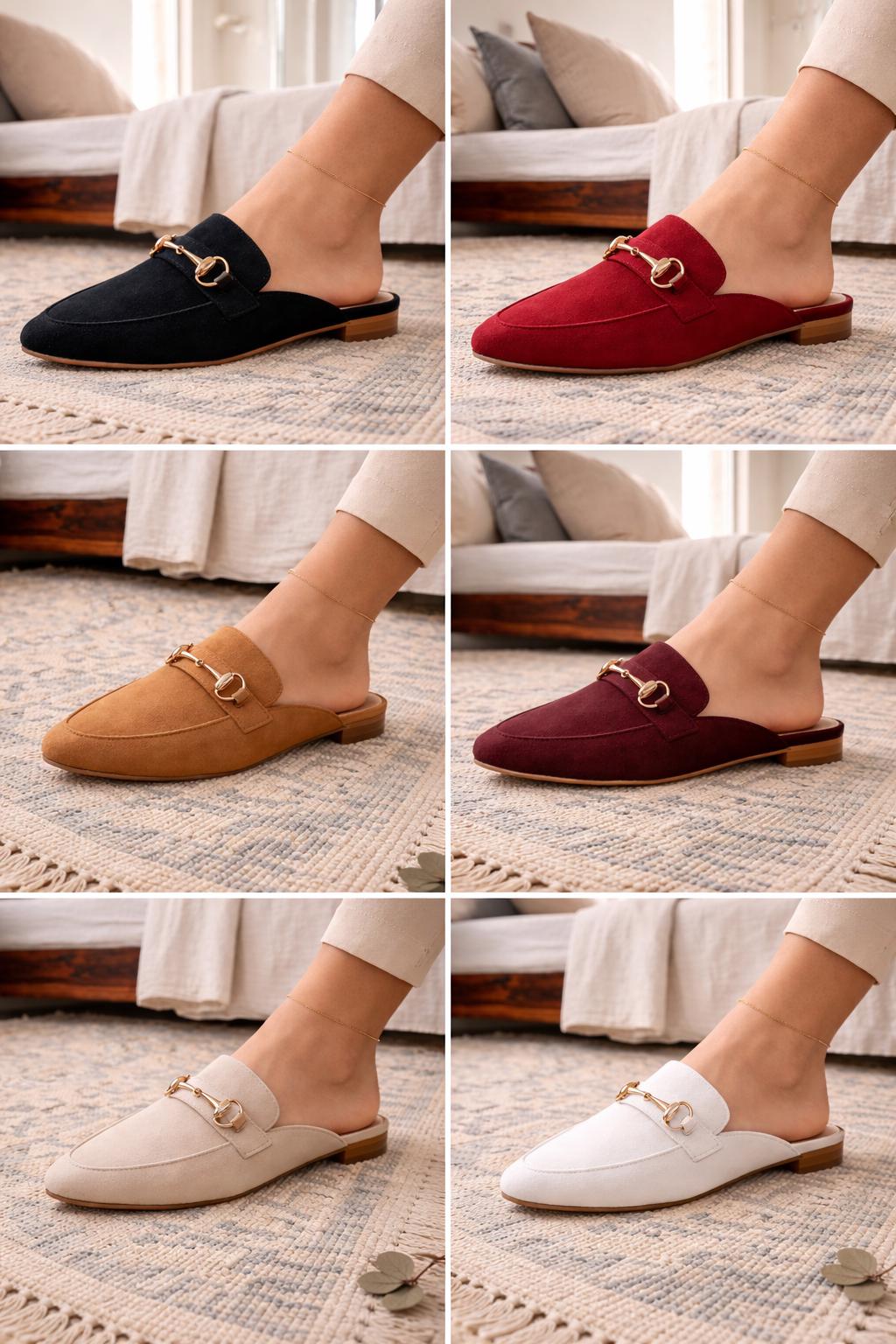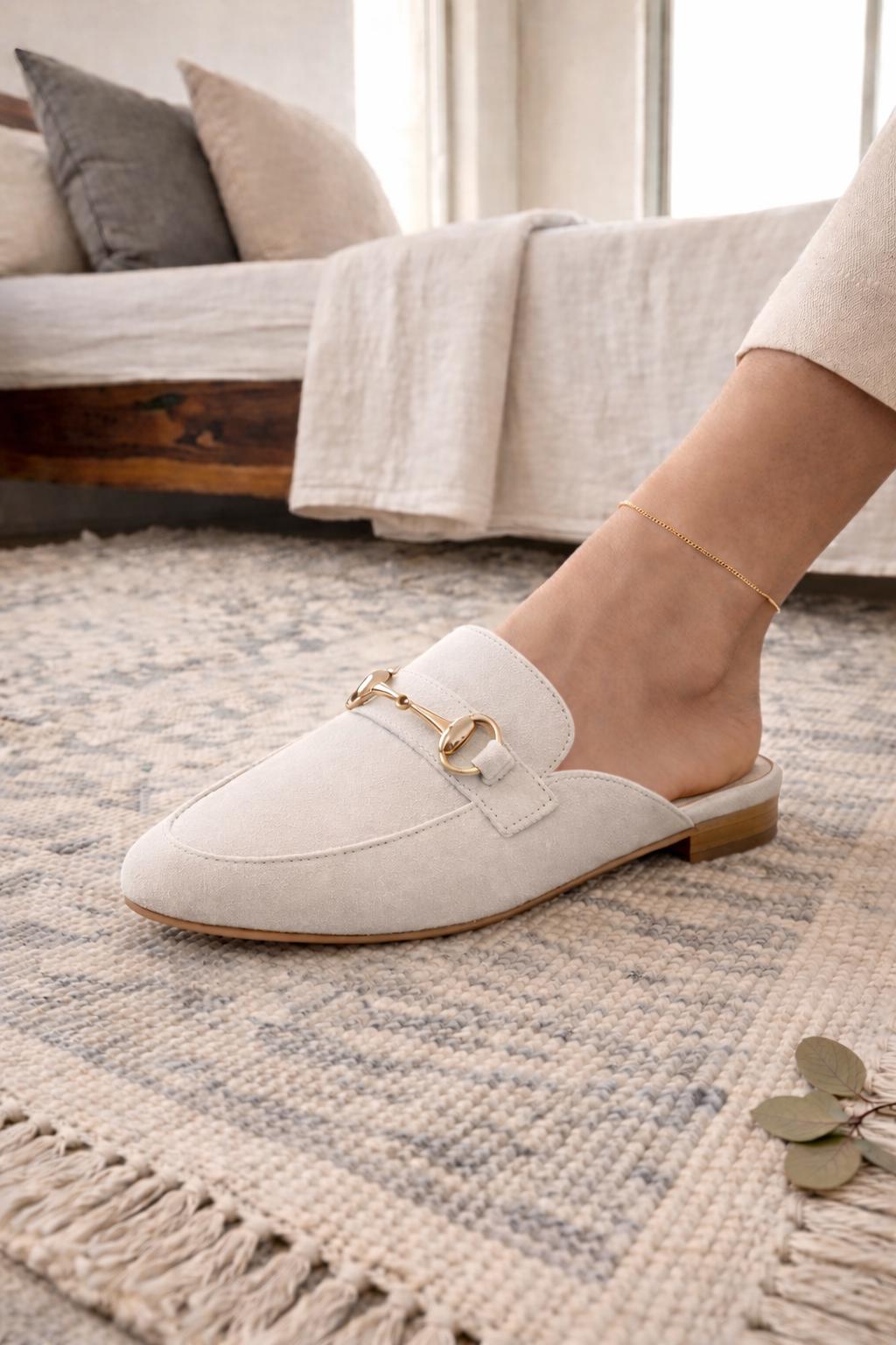 Mules femme en daim beige, pointues, boucle dorée, couleurs au choix, fait main au Maroc