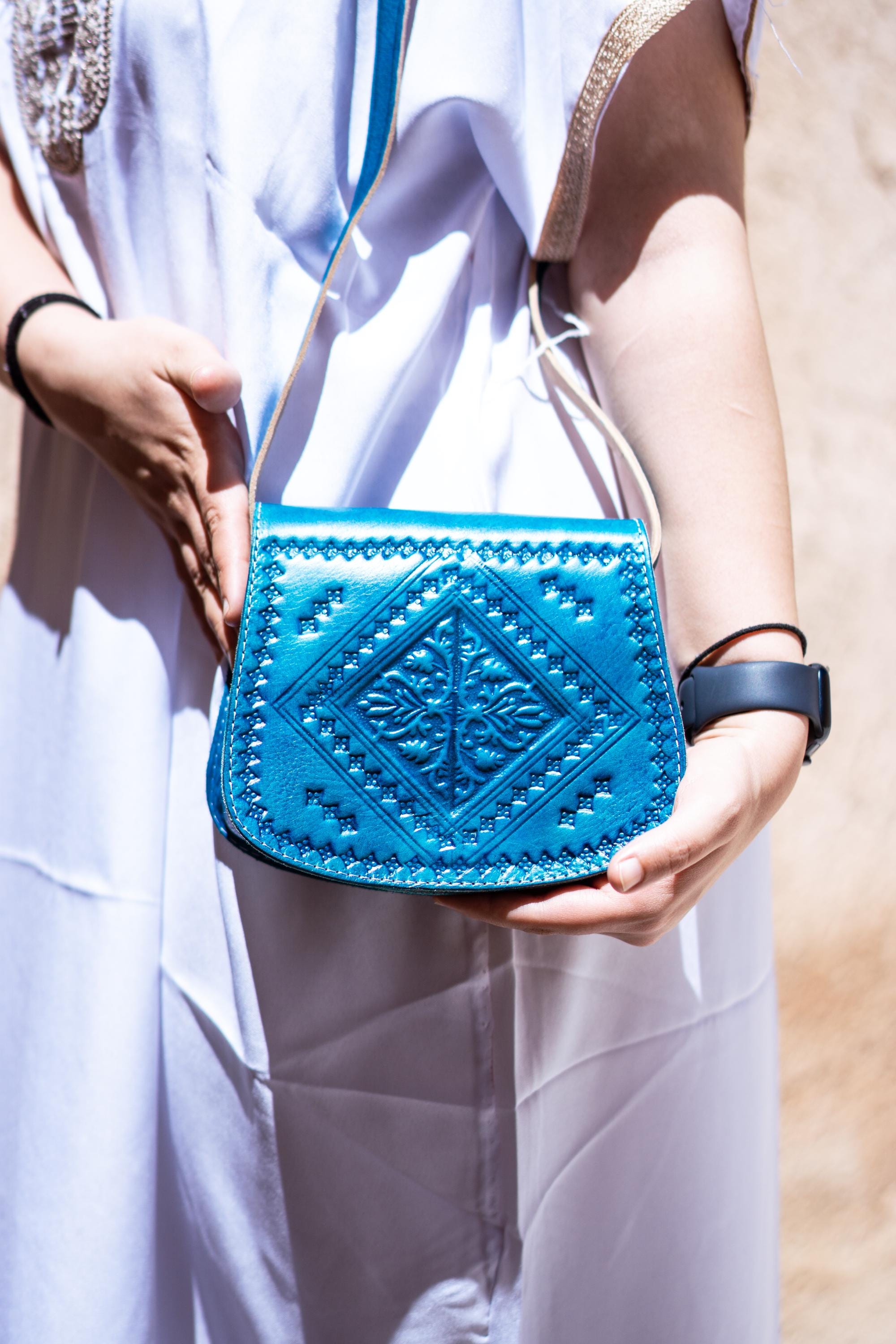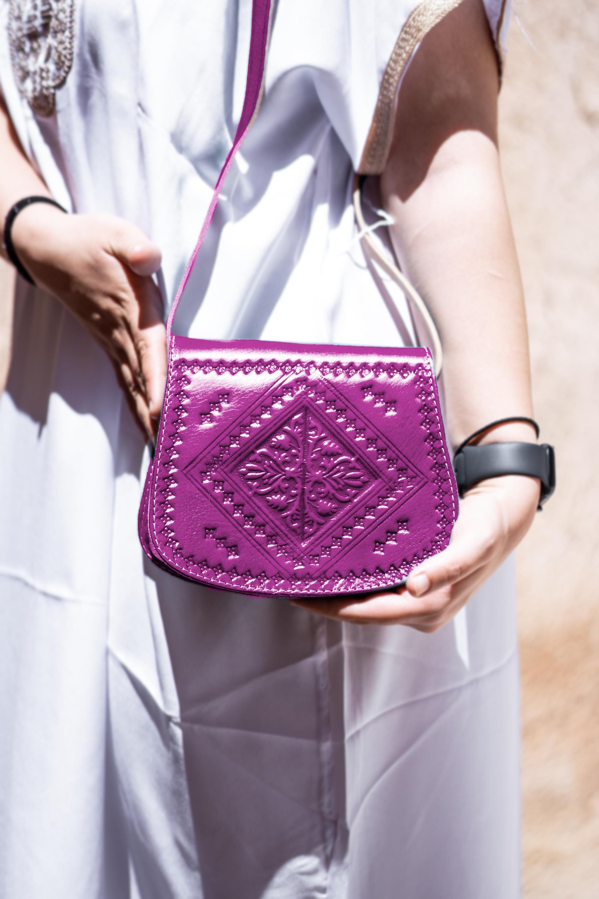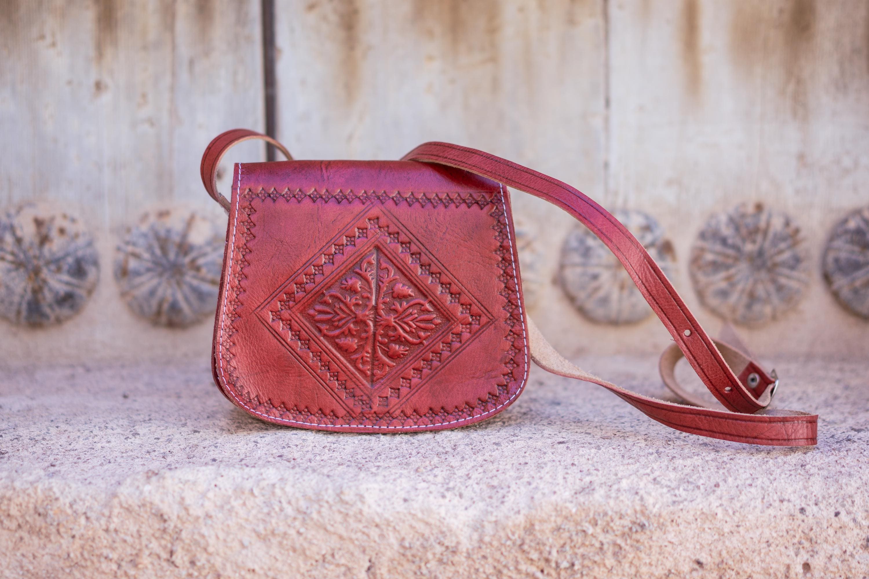Small Moroccan Leather Crossbody Bag – Hand-Embossed Boho Shoulder Purse – Authentic Satchel