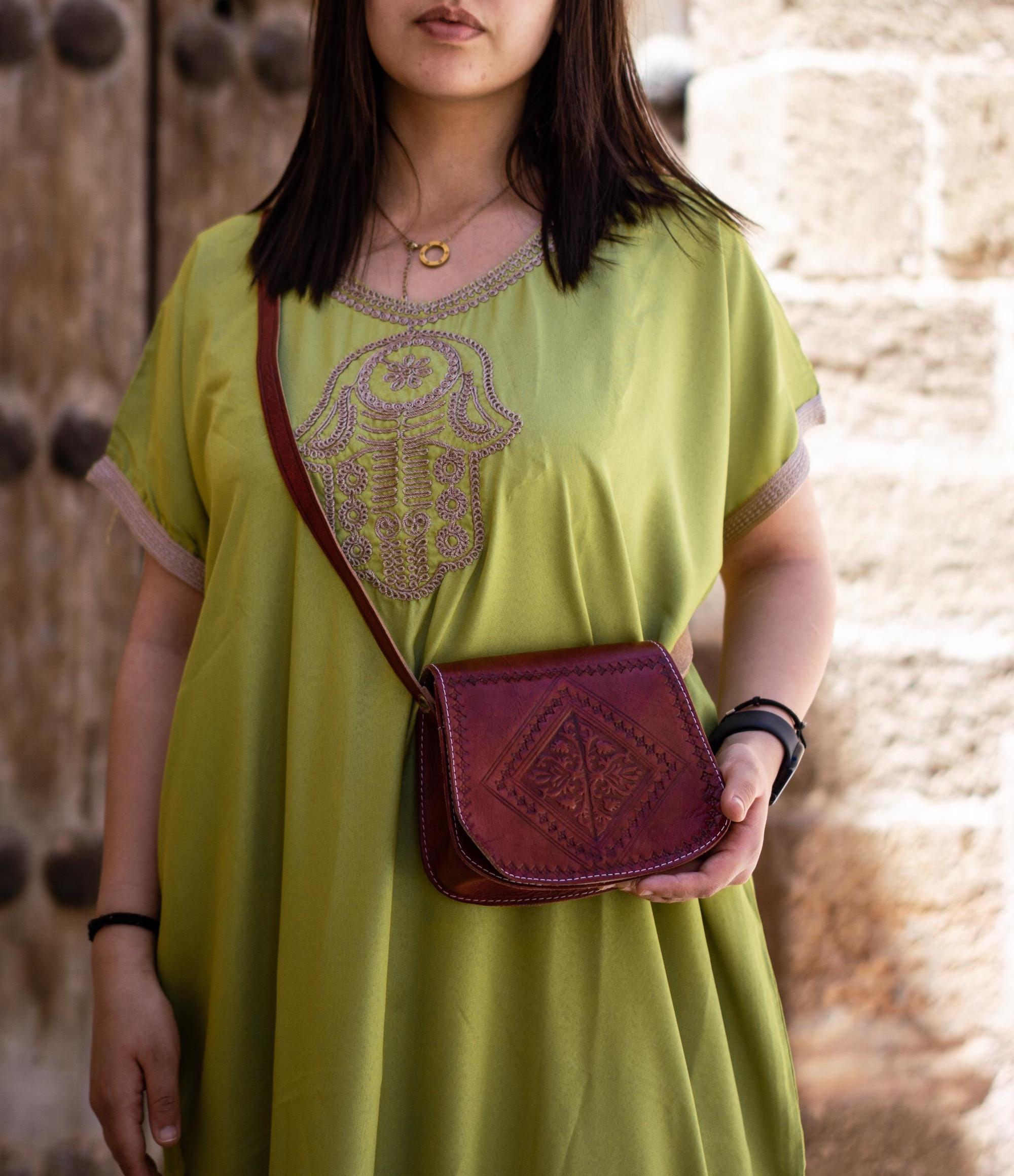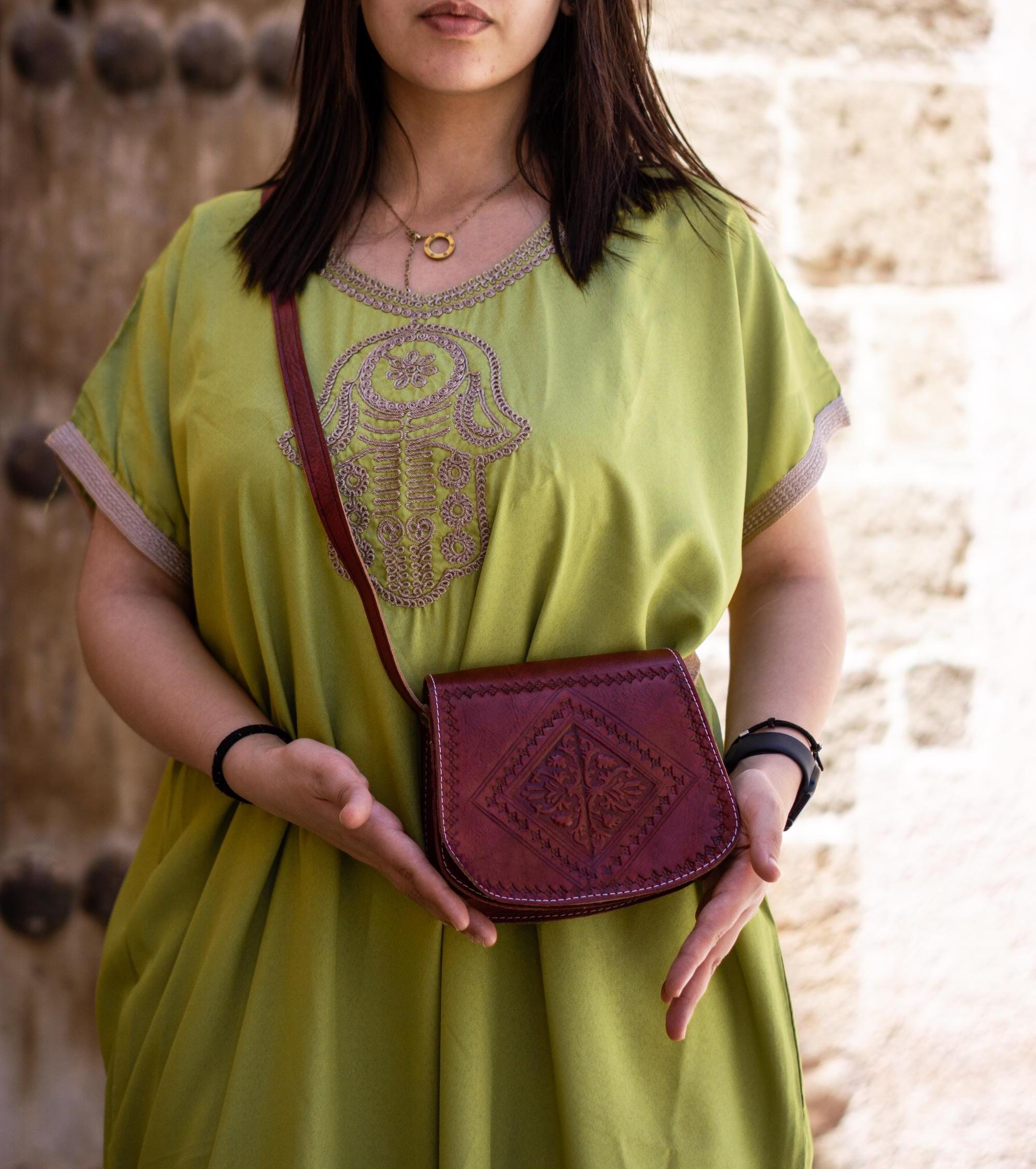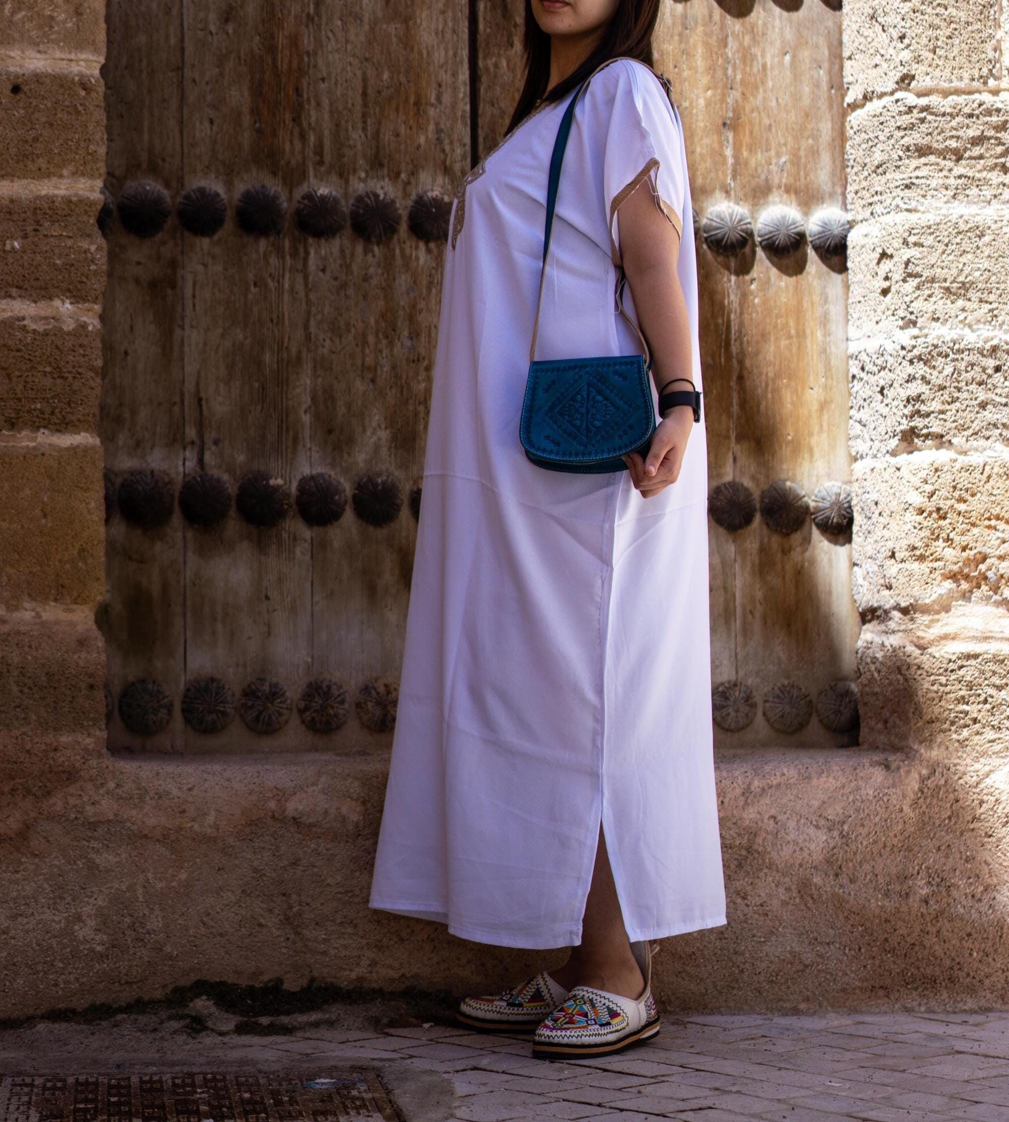 Love the full outfit? The authentic Moroccan leather bag and embroidered slippers (Babouches) worn by the model are also available in our shop. Browse our collection to mix and match your perfect look!
