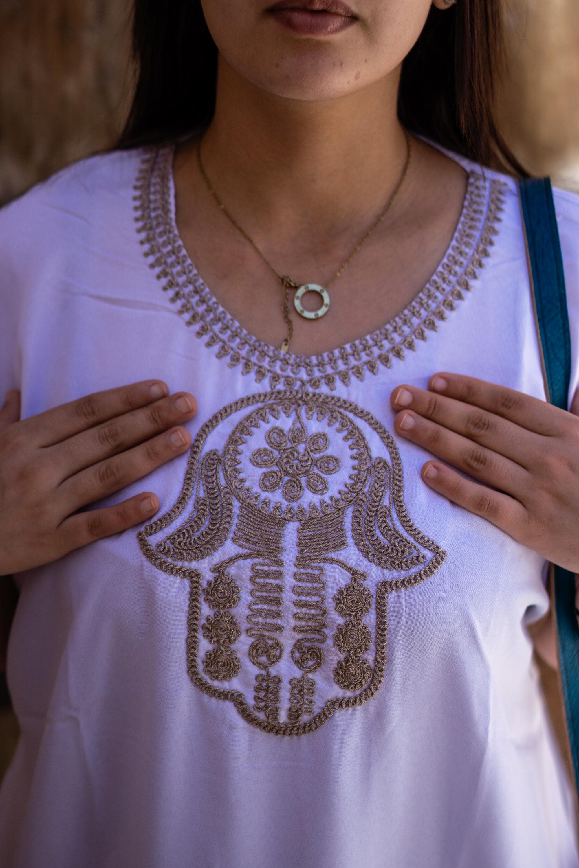 This beautifully crafted, lightweight maxi tunic features a stunning, intricate embroidery of the "Hamsa" (Hand of Fatima) on the chest—a universal symbol of protection, strength, and good luck.