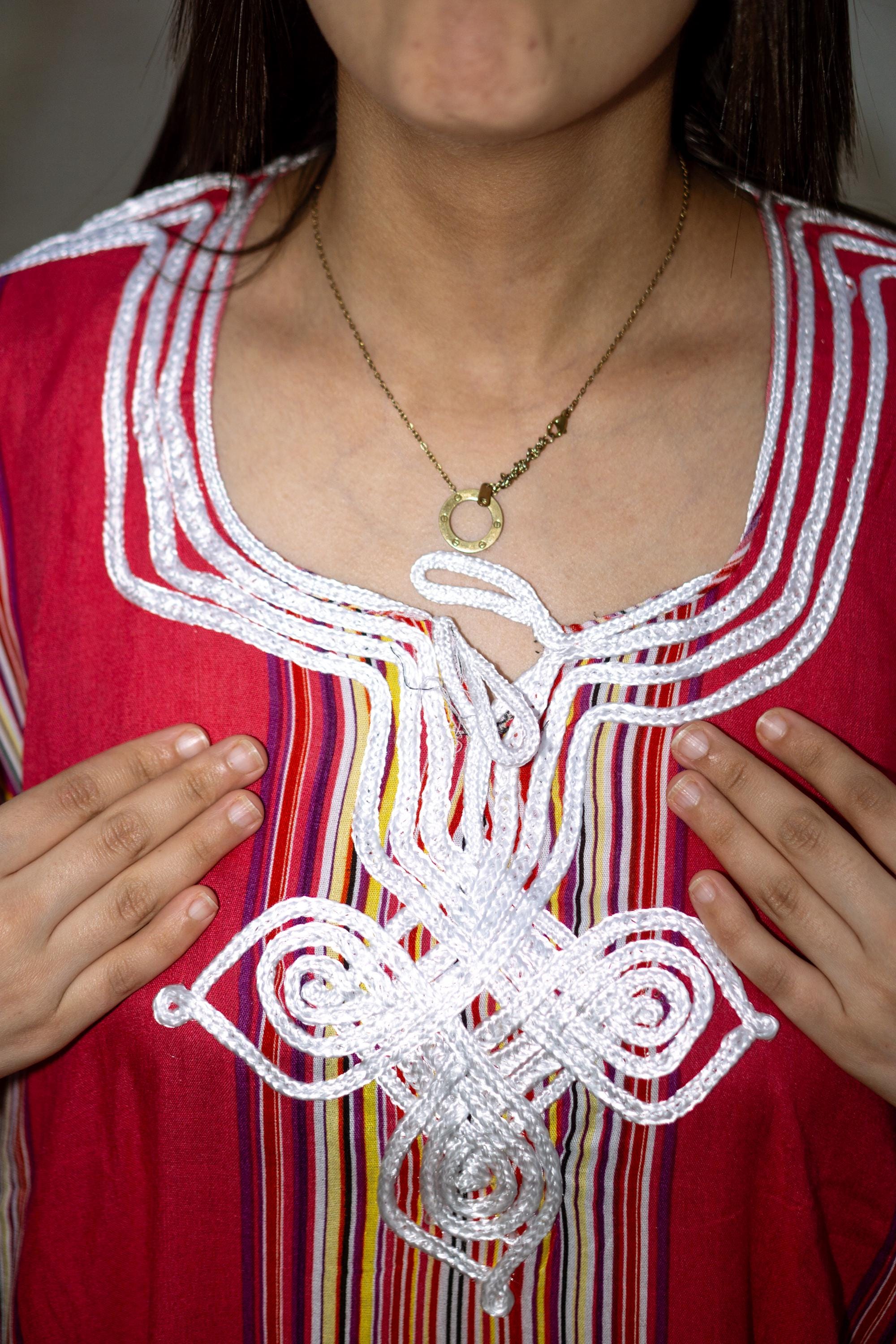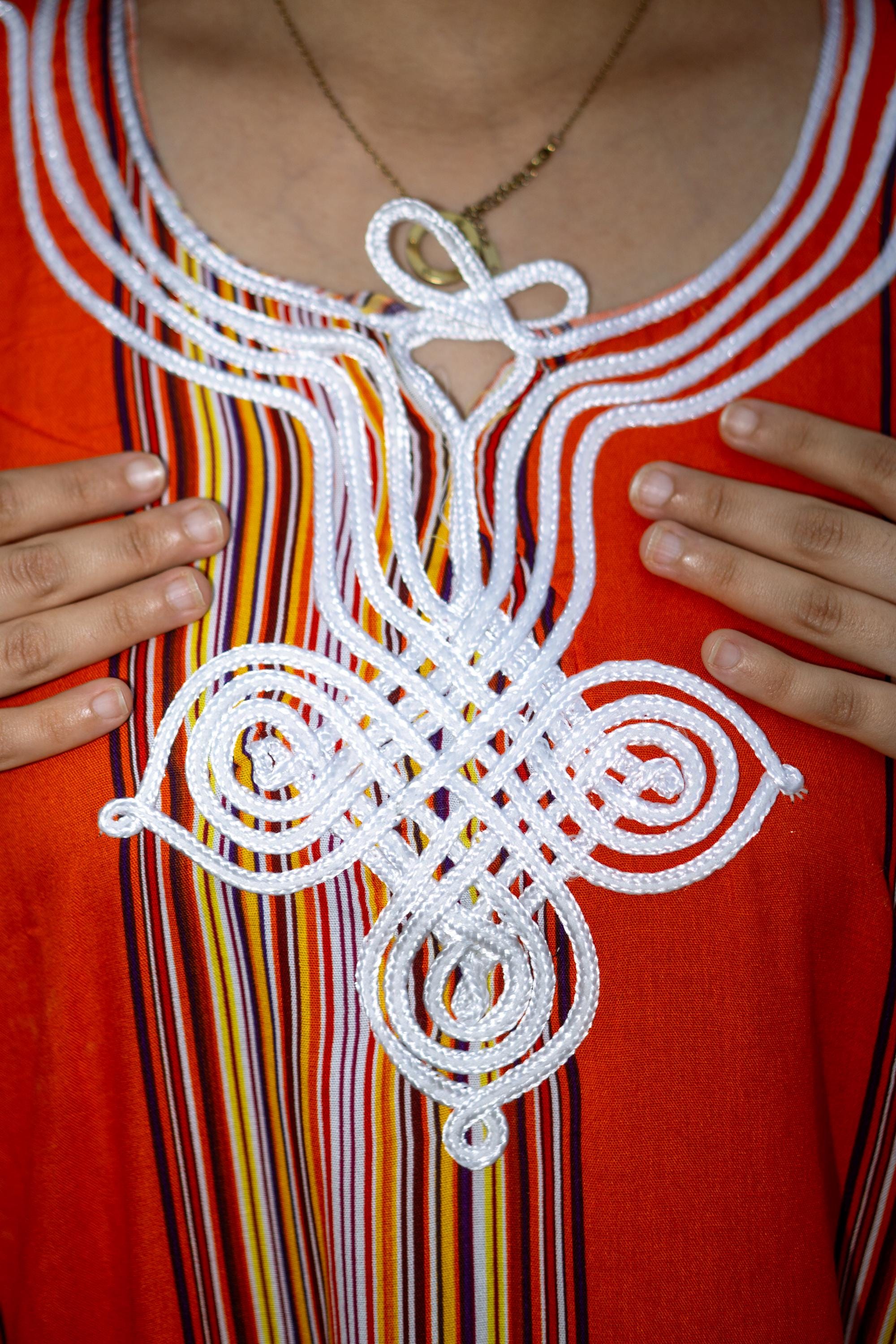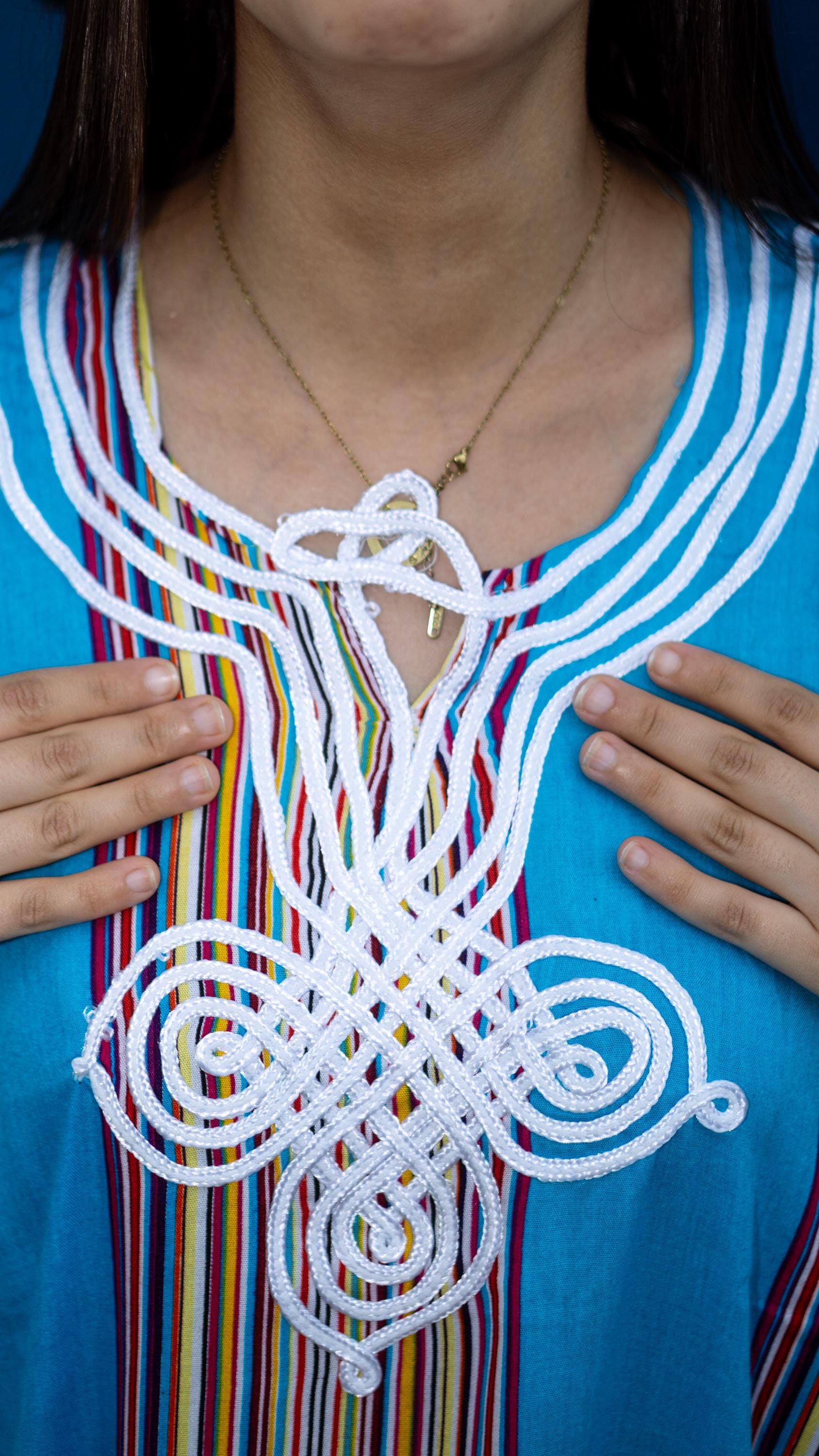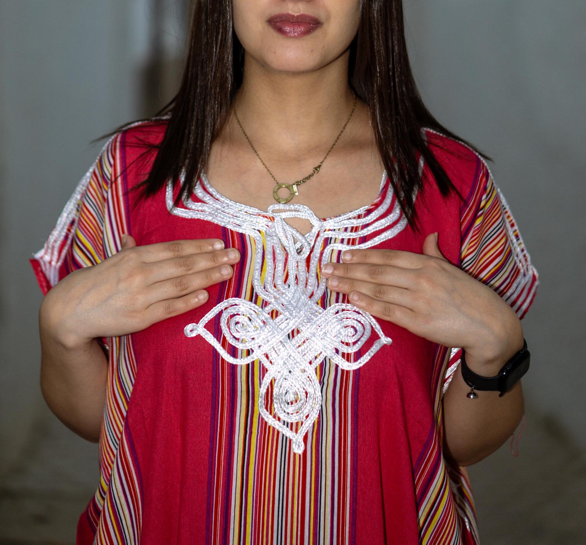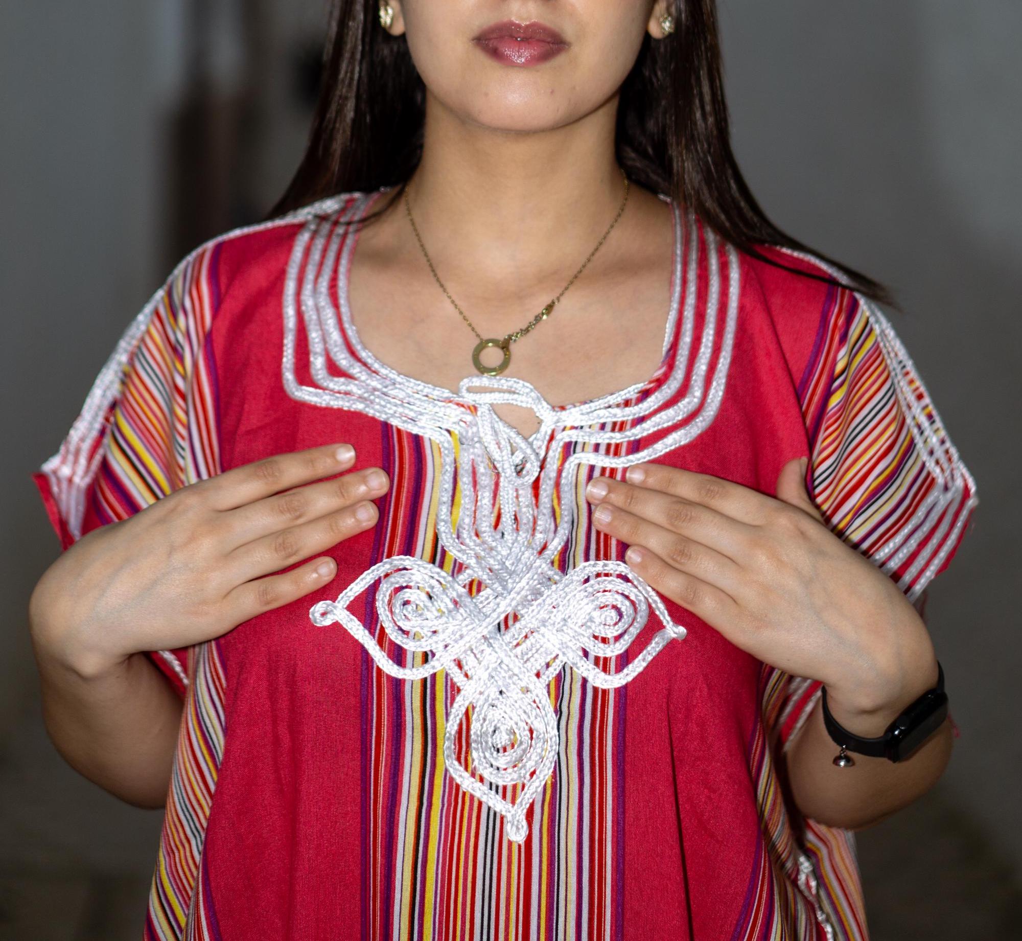 This beautiful maxi dress combines traditional Moroccan craftsmanship with vibrant, modern summer vibes. It features a stunning, intricate white embroidery (traditional "Sfifa" braiding) on the chest, beautifully contrasting with the colorful vertical stripes that naturally elongate and flatter your silhouette.