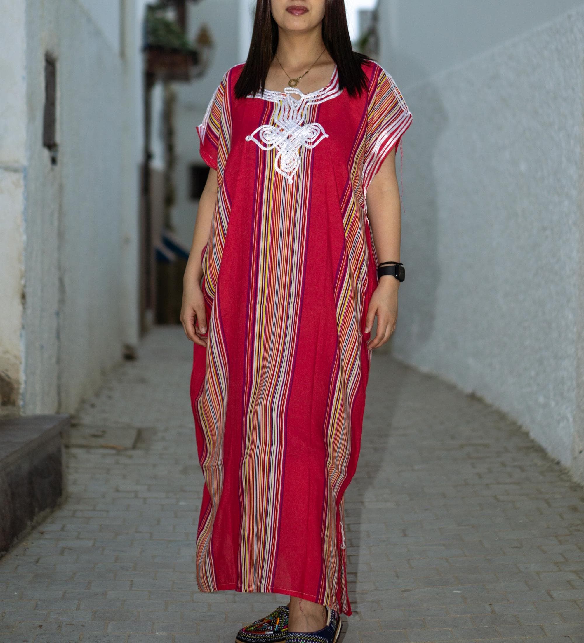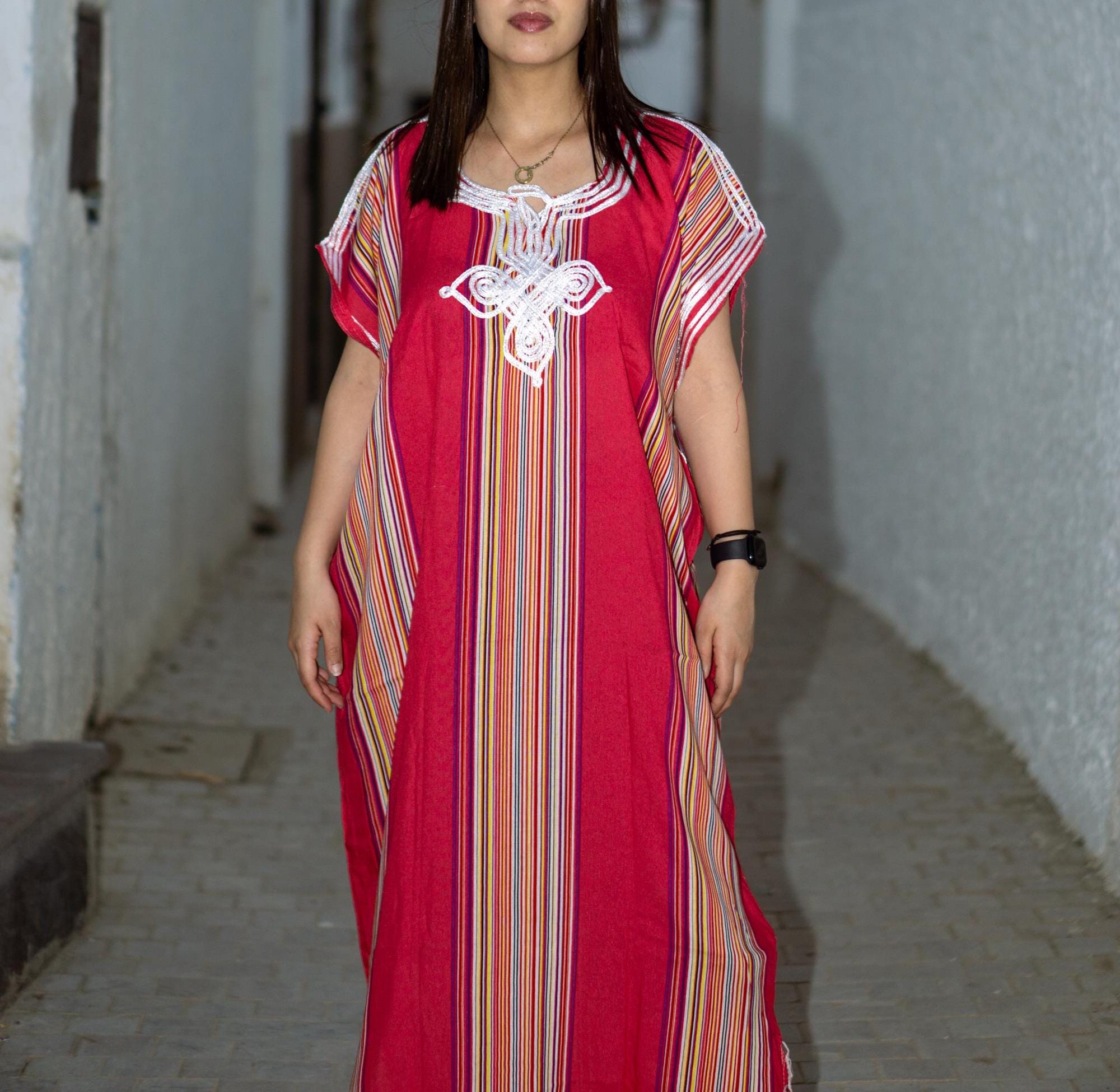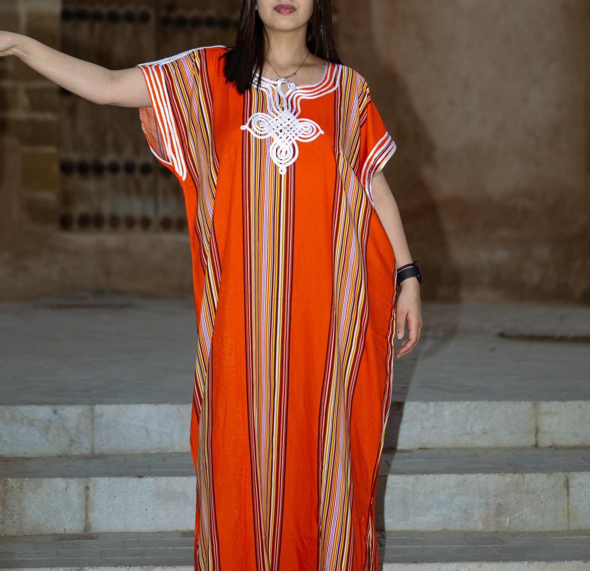 Make a colorful statement this summer with our authentic Moroccan Striped Kaftan! 🌴🌊